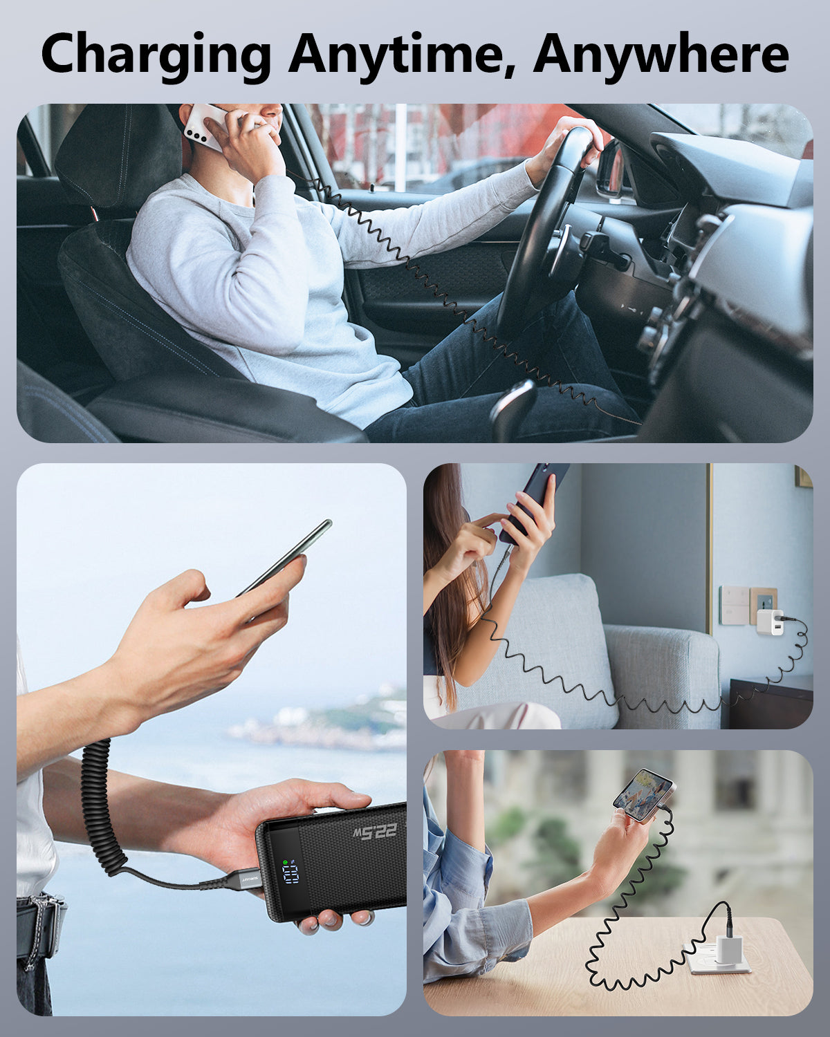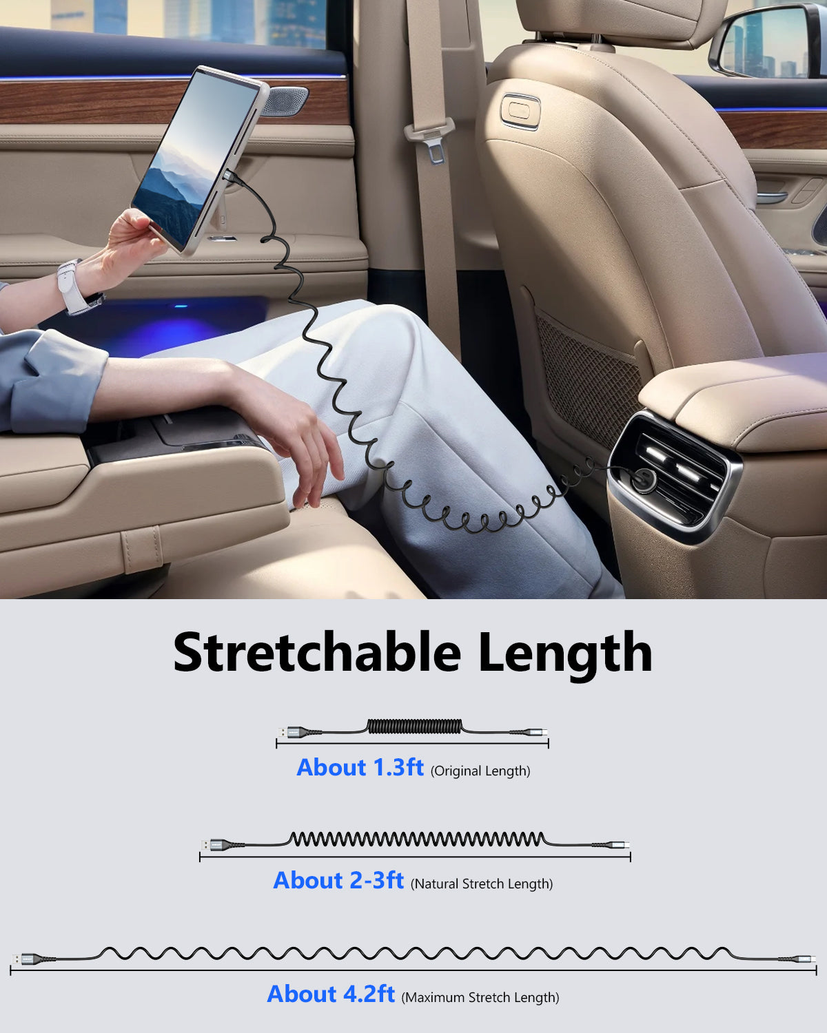 - Length of Use: 1.4 Ft before stretching, maximum stretch length is 4FT. Comfortable length of use is 2-3ft. Suitable for charging your devices in the bedroom, on the sofa, in the office, while travelling. Easy to use for different occasions, meet your different needs.