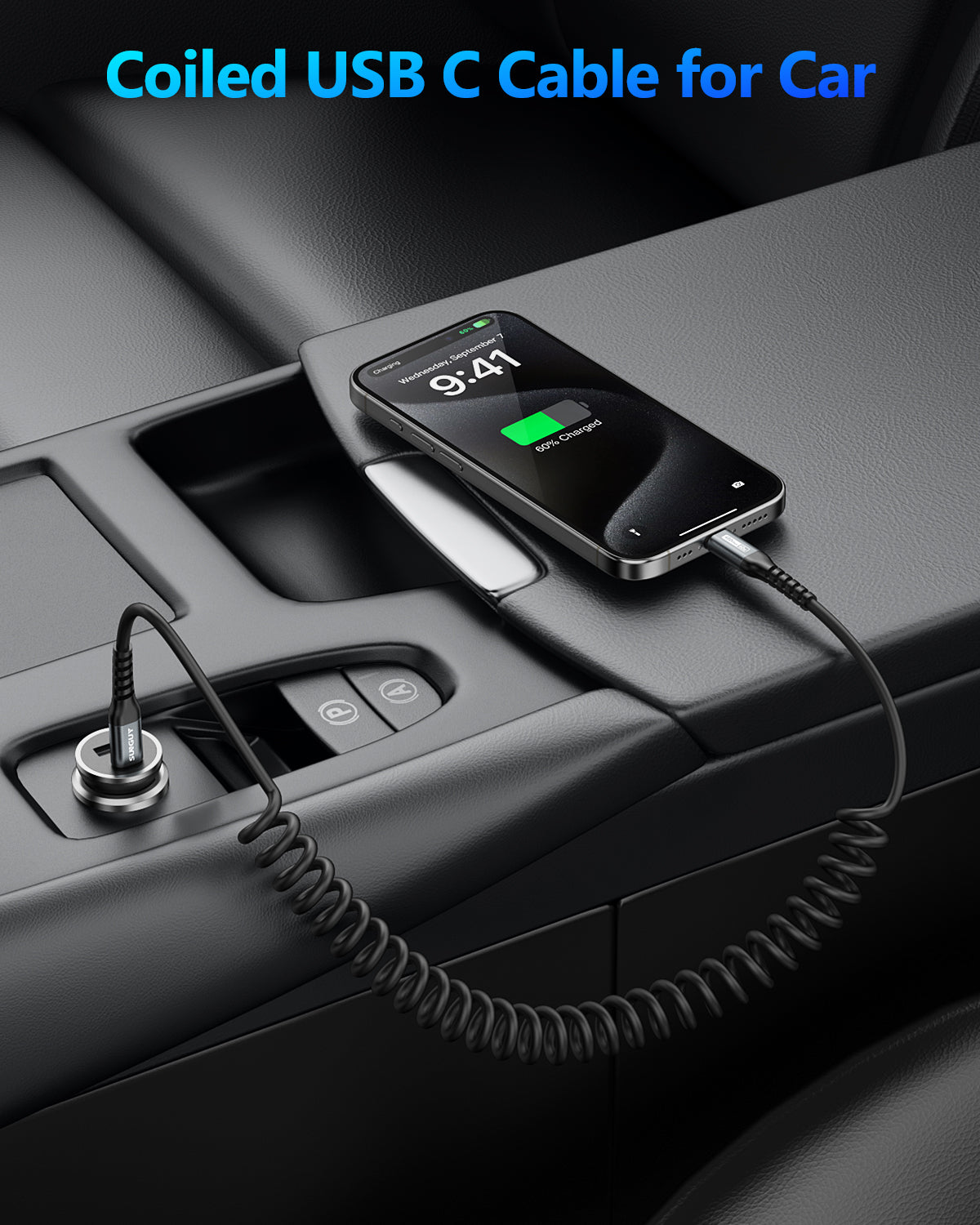 SUNGUY Coiled USB C to USB C Charger Cable for Car, Android Auto USB-C Fast Charging Cord, B060CC