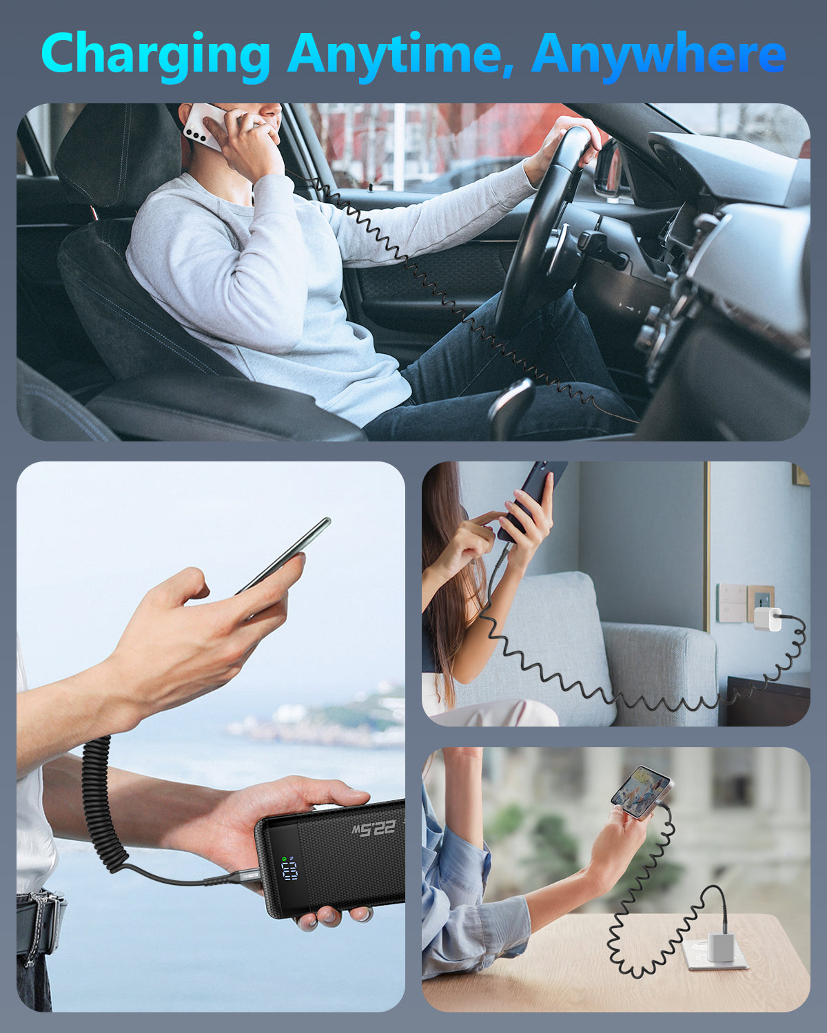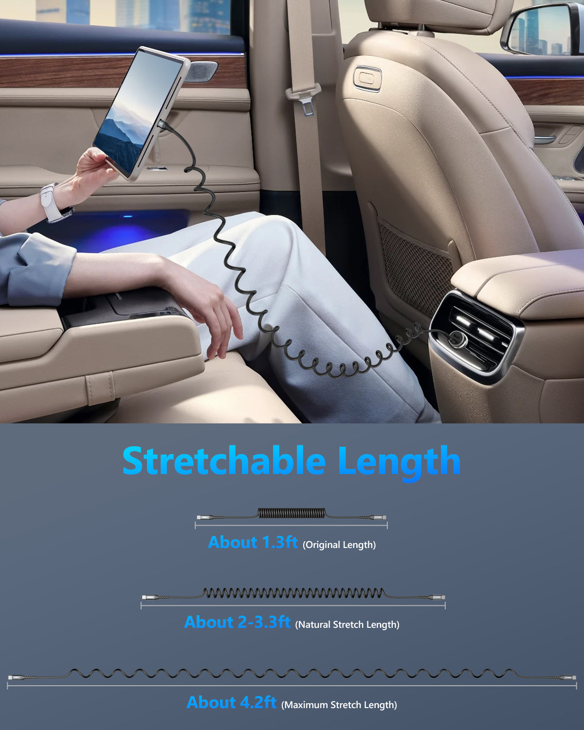 - Flexible Length: The coiled USB-C cable is about 1.3FT before stretching, and the max stretch length is about 4FT-4.2FT. The comfortable length of use is 2FT-3FT and bounces back to normal length well. Convenient for charging your devices in the bedroom, on the sofa, in the office, or while traveling.