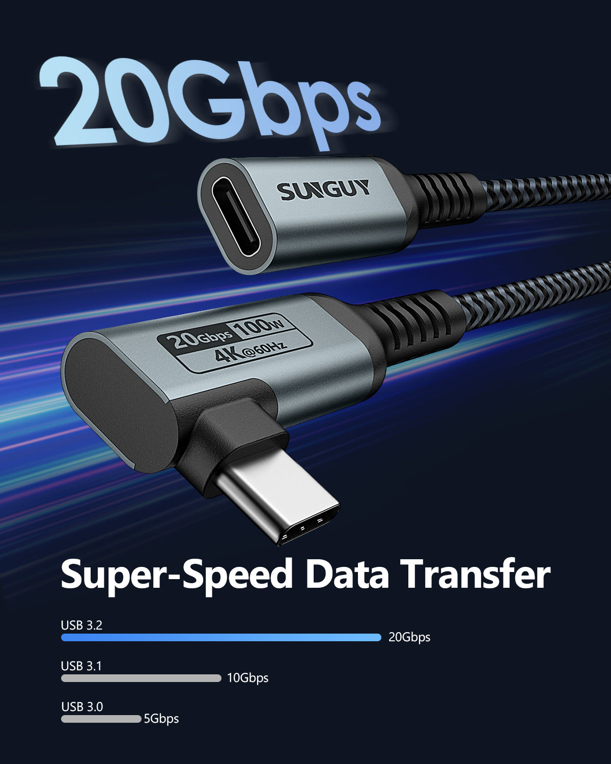 SUNGUY USB C Extension Cable 20Gbps 4K Output USB 3.2 Gen2 USB C Male to C Female 100W Charging Cable, B122