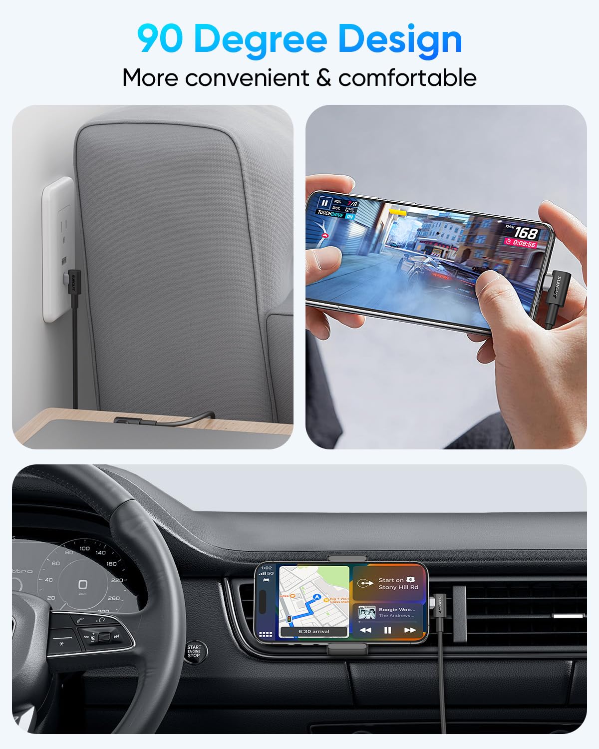 - Double Right-Angle Design: This 90-degree cable uses a double elbow design, saving space, allowing you to comfortably play games and watch movies while charging. Note: This cable is not suitable for thick mobile phone case.