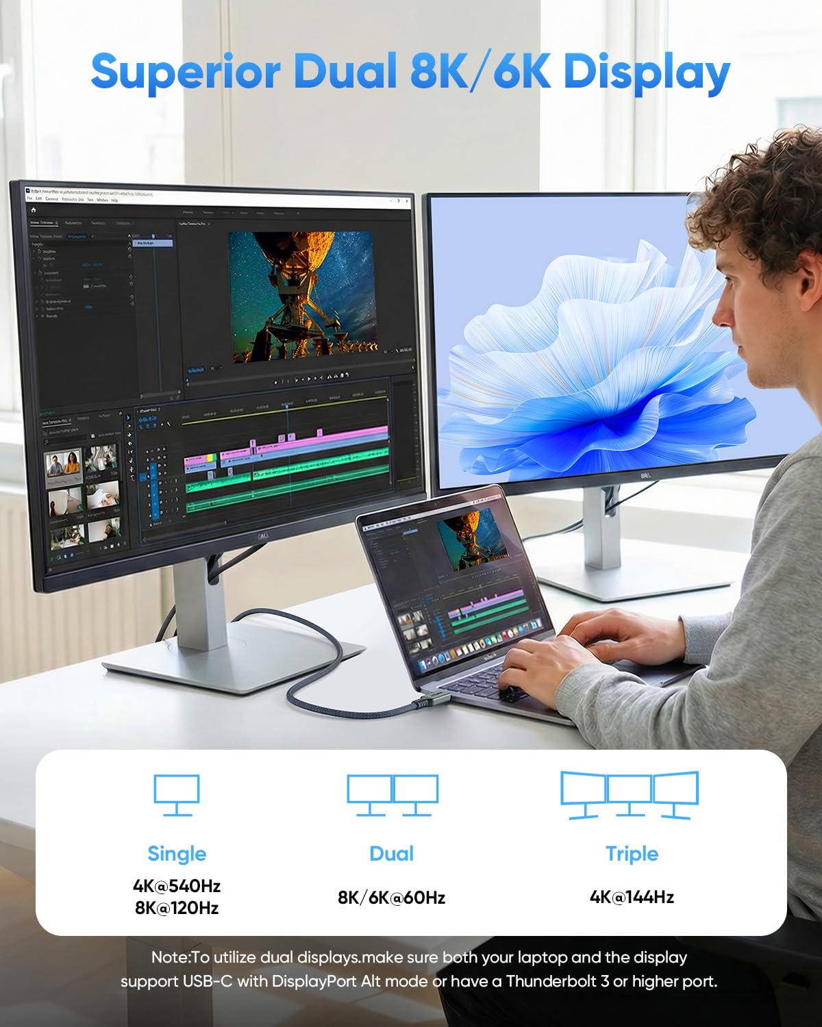- Dual 8K HD Display: Enhance your visual experience by connecting your laptop to an external monitor to mirror or extend your screen in dual 8K/6K or triple 4K@144Hz configurations, ideal for professional workflows. It supports 16K resolution and 4K@540Hz for ultimate creative and gaming performance. USB C Video Monitor Cable: This UHD 8K crystal-clear USB-C display cable is designed for content creators, graphics designers, video editors, and gamers. It delivers 4K@540Hz high-resolution displays with low-latency visuals, making it efficient for handling increasingly large video and data files—3x faster than Thunderbolt 4 and USB4 40Gbps.