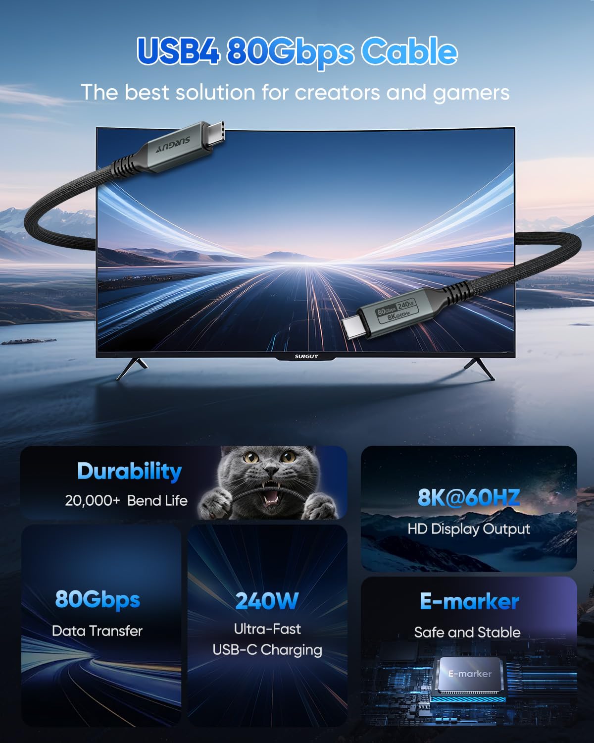 SUNGUY USB C to USB C Cable, 80Gbps Data Transfer 240W Fast Charging, B142